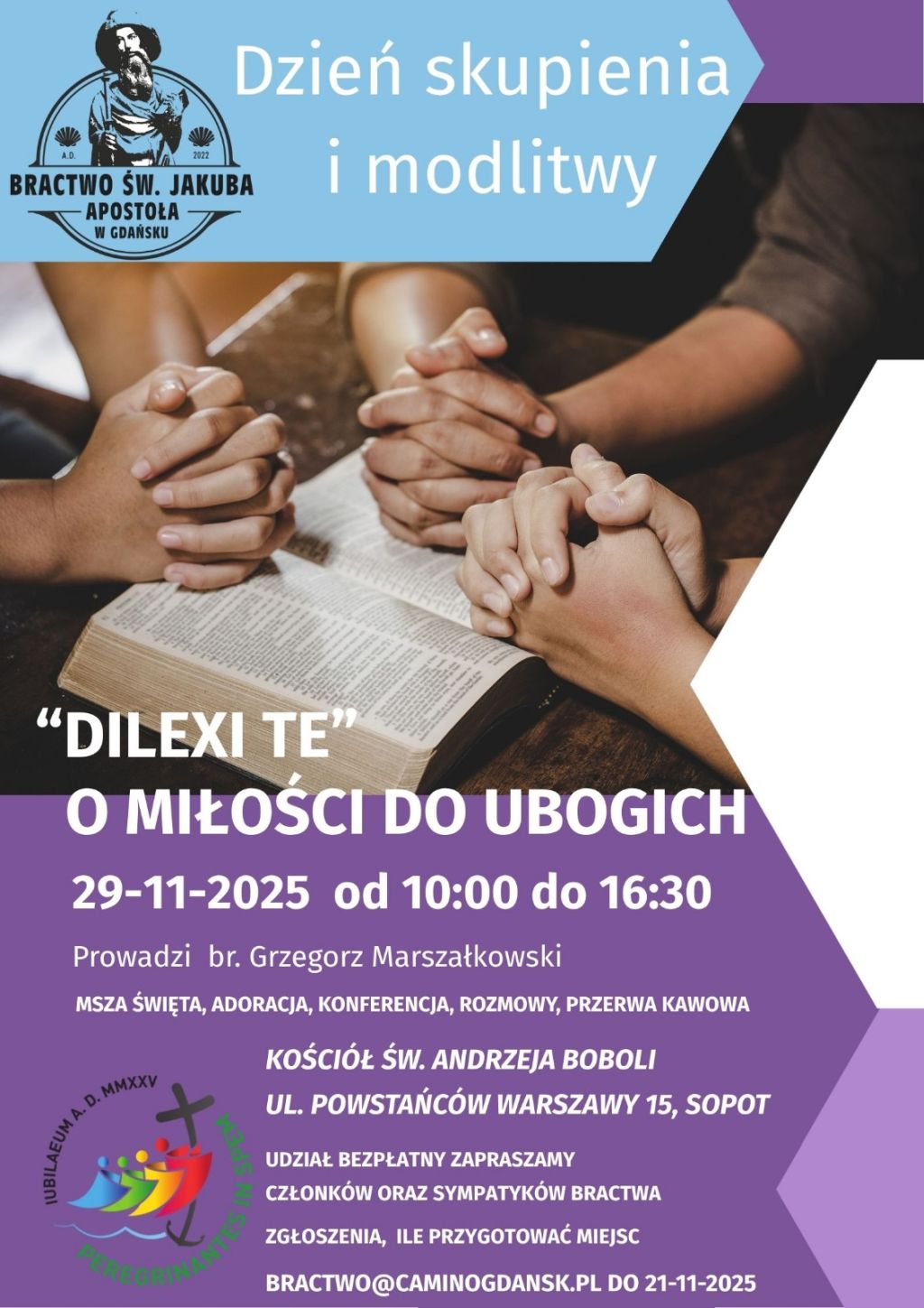 Zapraszamy członków Bractwa św. Jakuba, sympatyków oraz tych, którzy pielgrzymują drogami „Camino” na dzień skupienia do Parafii św. Andrzeja Boboli w Sopocie 29 listopada od godziny 10.00.
